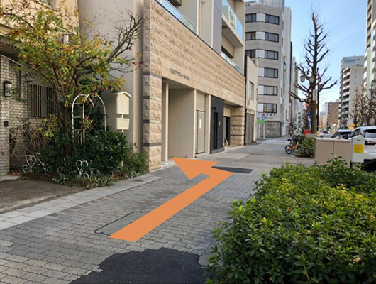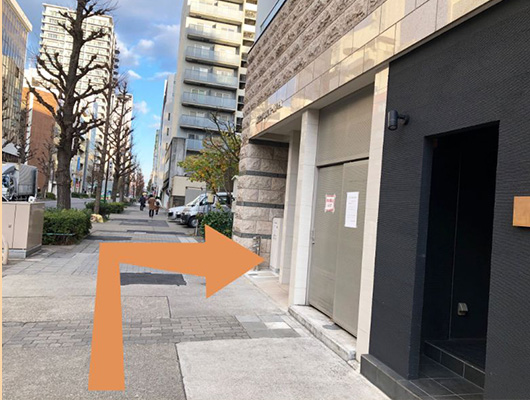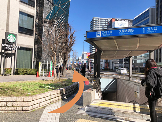 地下通路1番出口から地上へ出て、右手のスターバックスが入ったビル(KDX桜通ビル)を正面に見て右(北)方向へ進む。