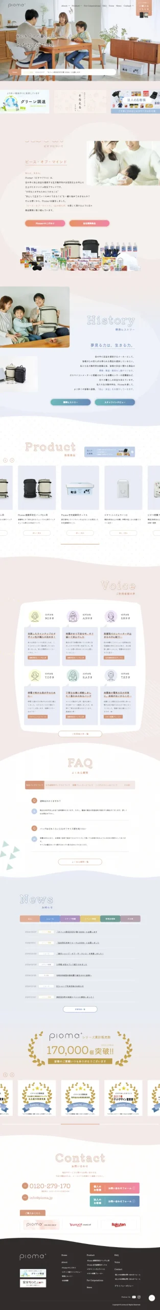 生方製作所様が女性防災士を中心に立ち上げたオリジナル防災ブランド「Pioma+(ピオマプラス)」のブランディングサイトの制作をご依頼いただきました。別途ご依頼いただいているコラムサイトや通販サイトとは別に、ピオマというブランドの持つ力をより多くの方に知っていただくためのブランディング専用サイトを、それぞれと連携させる形で新たに立ち上げたいとのご要望でした。自社開発商品への強いこだわり、女性防災士・母親・一被災者の目線から「本当に必要なもの」を選び抜いたという想いをしっかり伝えたいというお気持ちがありました。